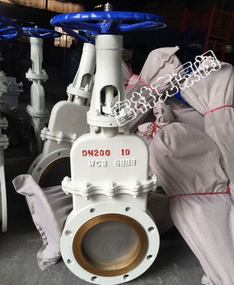 2.闸板上端和阀体底部配置了闸板压紧装置,由阀杆垂直推力转换成侧向力来实现闸板贴紧阀座形成有效密封。