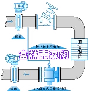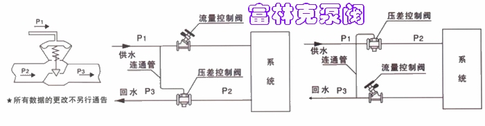 4.便流量的水平之平、干管入口处以及在安装温控阀、调节阀等的动态系统的支、干管入口处、安装自立式压差控制阀可使被控系统、回水管之间的压差保持恒定值。