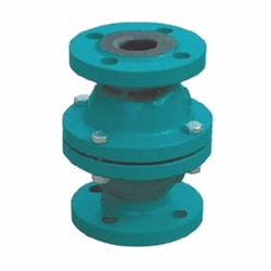 富林克H40J浮球式衬胶止回阀专用于控制非腐蚀性或一般腐蚀性介质,阀体内腔表面覆有可供选择的各种橡胶,是一种新型结构,阀瓣为球型,特点是衬胶浮球沿阀体通路轴线做升降运动,液体只能让垂直向上流动,一旦液体停直向上流动时,浮球靠本身的重量自动掉落至原位,与阀体内部的密封圈相结合,致使阀门自动关闭。