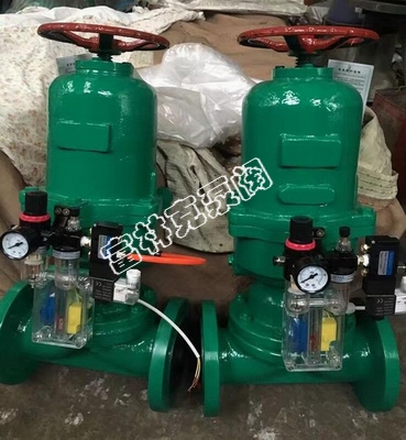 往复式气动隔膜阀的气缸分为上下两个进气腔,利用二位五通电磁阀进行对气源的切换,当气源进入上气缸控制腔,打开阀门通道,当气源进入下气缸控制腔,阀门通道被关闭。阀门没有阀杆、密封垫、定向座等,通道中运动的唯一部件就是隔膜,所以不存在锈蚀及抱死现象,具有更高的稳定性
